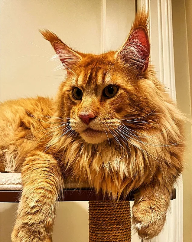 The mainecoon is often described as having an elfin appearance, with their large ears, high cheekbones and striking eyes. Their outstanding characteristic, however, is their soft, wavy fur. Their curvy body starts with their head, a modified wedge shape with convex curves forming the outer edge of the ear lobes, the cheekbones and the whisker pads. The mainecoon has large, wide-set, oval-shaped eyes and strikingly large ears set low on the head. Sometimes the tips of the ears are tufted with fine fur.